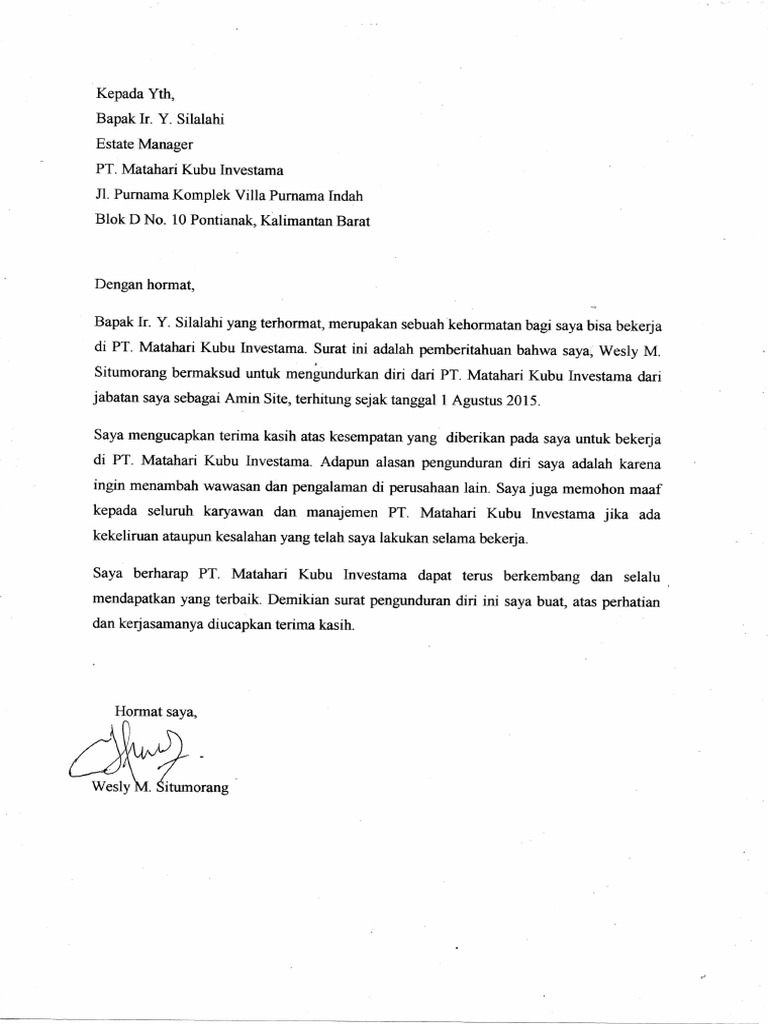 Jika anda masih bingung mengenai menulis surat resmi dalam bahasa inggris, berikut ini contoh sederhana surat resmi (formal letter) seperti surat lamaran pekerjaan dan surat undangan resmi dalam bahasa inggris dan terjemahannnya sebagai bahan refrensi untuk anda. Pada surat, gunakan bahasa indonesia yang baik dan benar karena yang sedang kamu buat adalah surat resmi. Surat resign atau surat pengunduran diri dari pekerjaan. Terkadang ada banyak hal disaat kita bekerja di sebuah perusahaan atau instansi yang membuat kita. Contoh surat resign banyak dicari pekerja yang berencana mengundurkan diri. Berikut contoh surat lamaran pekerjaan terbaru 2019 resmi yang baik dan benar dengan format formal yang bisa anda unduh untuk melamar di perusahaan isi surat isi surat berisi tentang mengapa kita membuat surat ini. Secara resmi mengajukan permohonan pengunduran. 00 upvotes, mark this document as useful. Dalam suatu instansi atau perusahaan diperlukan. Surat ini biasa ditujukan kepada wali murid atau kepada pihak lain yang memiliki keterkaitan. Baik itu di dalam sebuah perusahaan, instansi pemerintahan, lembaga pendidikan, dan lain sebagainya. Tidak hanya itu, sebelum anda mengirimkan surat pengunduran diri ke perusahaan anda bekerja, maka anda harus memastikan terlebih dahulu proses pengunduran diri dari pekerjaan sudah. Surat resign memiliki peranan yang sangat penting.